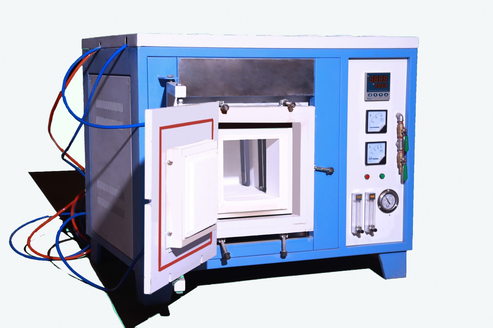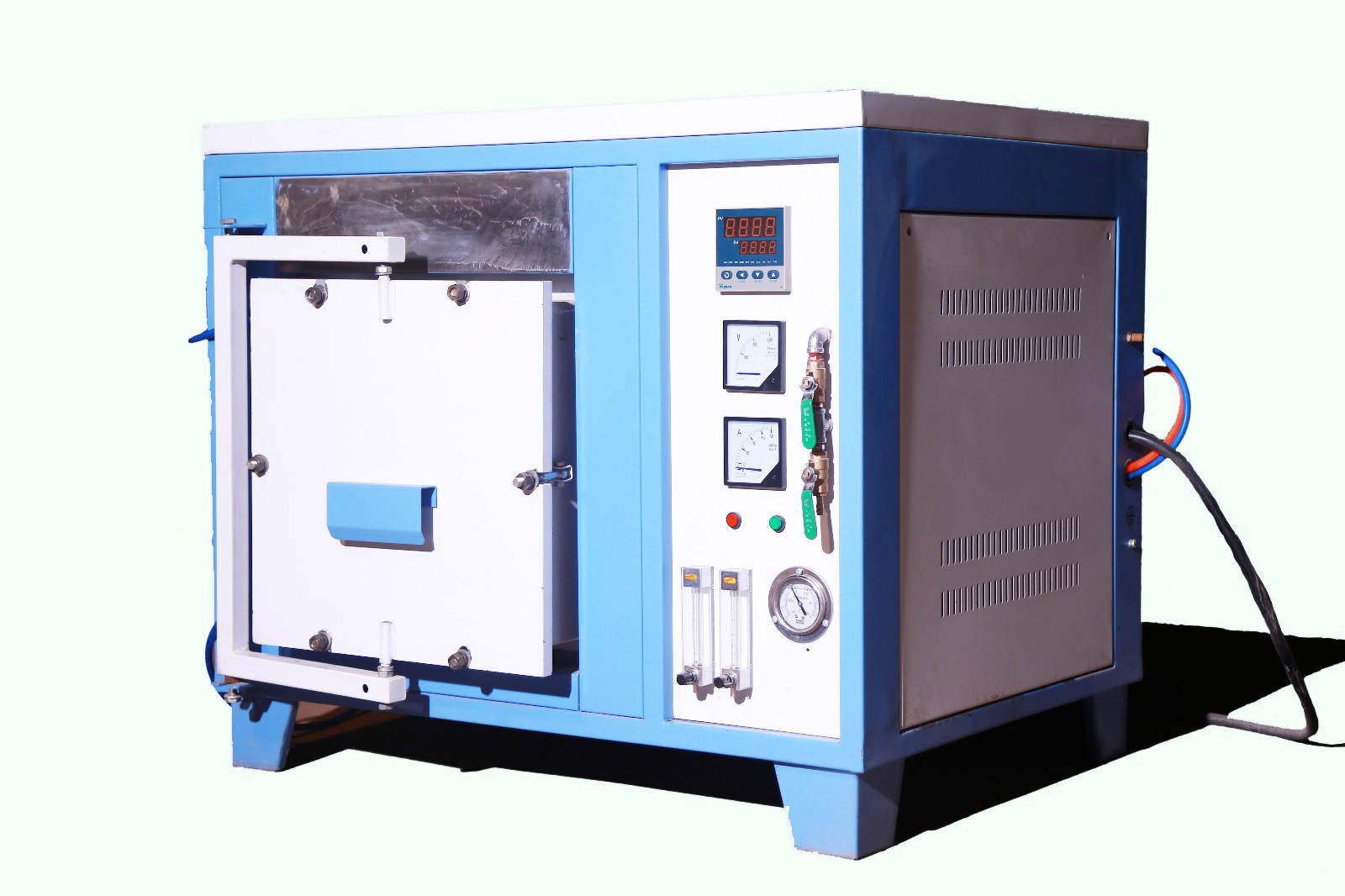 4、爐門為側開方式,從左往右(you)爐門及爐頂由緊固(gu)螺絲固(gu)定,爐門及爐頂配備循環水冷系統,爐體上有進氣(qi)口(kou)、出氣(qi)口(kou)、抽(chou)真(zhen)空口(kou)。可以(yi)通氫氣(qi)、氬氣(qi)、氮氣(qi)等(deng)其他(ta)惰性氣(qi)體,并能預抽(chou)真(zhen)空,真(zhen)空度可以(yi)達(da)到(dao)-0.1MPa,氣(qi)氛壓力(li)可以(yi)達(da)到(dao)-0.1Mpa,玻璃轉(zhuan)子流(liu)量計和進出口(kou)管道。